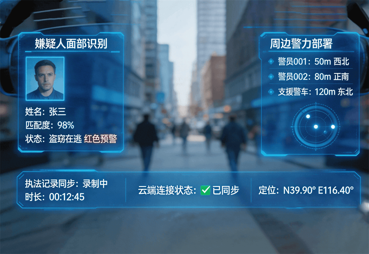融合AR智能眼镜与执法记录仪,在事故勘察、路面纠违时自动记录现场视频与位置信息。通过第一视角实时回传,指挥后台可远程画面指导,确保执法过程规范、证据采集完整。